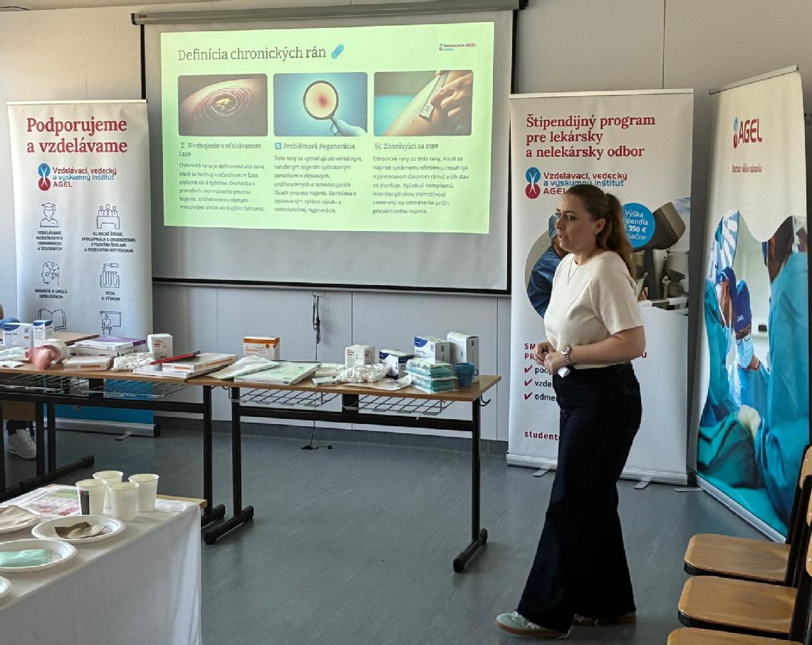 Najväčší dôraz však workshop kládol na praktickú časť. Študenti pracovali na realistických simulačných modeloch a pod odborným vedením vrchnej sestry chirurgického oddelenia Nemocnice AGEL Levice, Mgr. Kataríny Hájekovej si precvičovali techniku správneho preväzu, prácu s modernými krycími materiálmi či výber vhodného typu krytia podľa stavu rany.